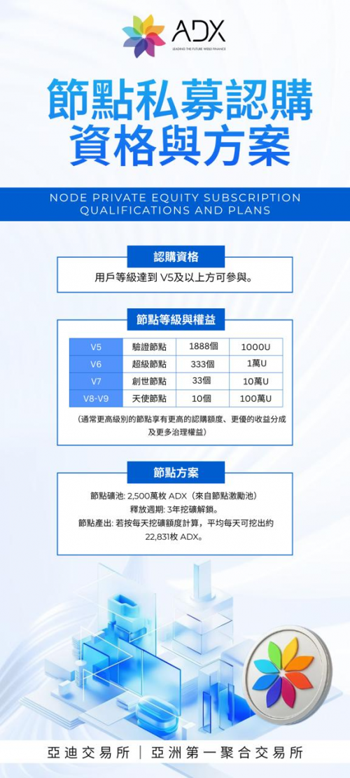 在经济模型设计上,ADX 展现了 Web3 精神与传统金融的完美结合。其推出的“币股同权”终极合伙人方案,是行业内罕见的利益共享机制。参与者将共享平台 10% 的营收和 10% 的币权分配。这一机制将用户从单纯的交易者转变为平台的深度合伙人,极大地激发了社区的长期持有和生态建设热情。