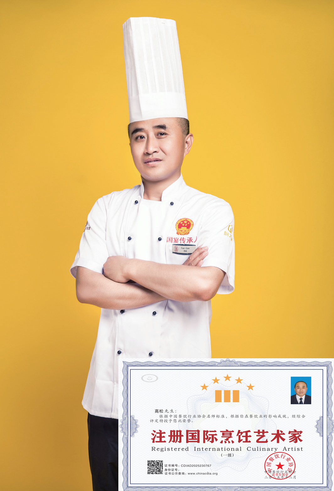 高松,中国烹饪大师工作室创始人、国宴御医传承人、国家级技能大师工作室首席专家、中国最美工匠大师、国家级餐饮健康战略专家讲师、高级中医药膳师,现任中国食品安全总监、营养配餐师。他师从国宴创始人王圣奎、药膳泰斗杨志智等四位国宝级宗师,深得国宴技艺与药膳智慧之真传,致力于推动中华饮食文化的传承与创新。高松以“融古汇今,以膳养身”为理念,成功研发《乾坤四象养元炸酱面》等系列创新药膳菜品,将传统炸酱面升华为融合四象养生哲学的健康膳食。他通过大师工作室培训、赛事交流及新媒体传播,积极推广药膳国宴文化,践行“让千年食药同源智慧惠及千家万户”的使命,在餐饮健康化、文化当代化的道路上持续探索前行。