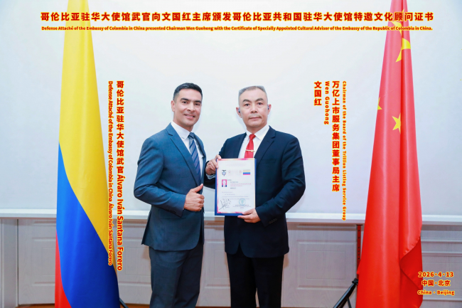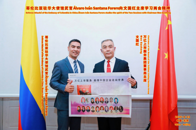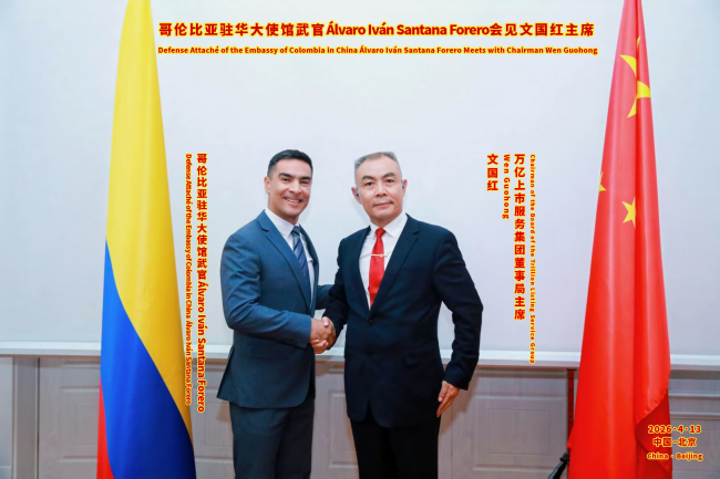 2026年4月13日,北京春光明媚,哥伦比亚驻华大使馆内气氛友好。万亿上市服务集团董事局主席文国红应邀到访,与哥伦比亚驻华大使馆武官阿尔瓦罗·伊万·桑塔纳·福雷罗(Álvaro Iván Santana Forrero)举行友好会晤。双方围绕数字经济、经贸往来、科技赋能、文化合作以及中哥两国在“一带一路”框架下的务实合作等议题深入交换意见,为推动两国企业在高科技与经贸领域的协同发展注入新动能、探讨新路径。